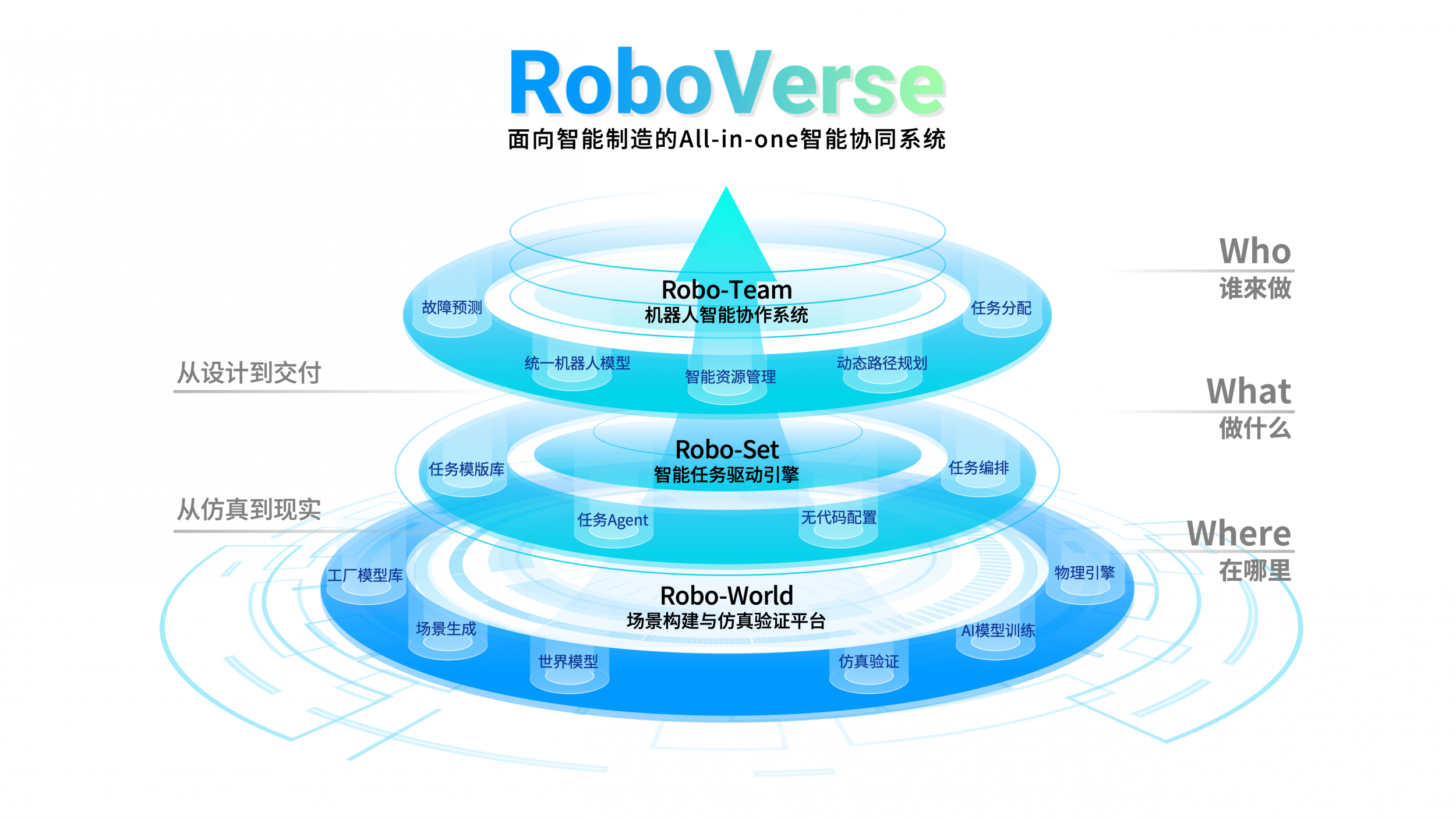 RoboVerse系统让机器人理解工厂,学会工艺,协同工作,包含三个子系统,即Robo-World、Robo-Set、Robo-Team,全周期覆盖客户咨询、方案设计及验证、项目交付和运营优化各阶段,实现仿真到现实的无缝衔接,助力全球工厂实现更智能、更高效、更可靠的数智化转型。